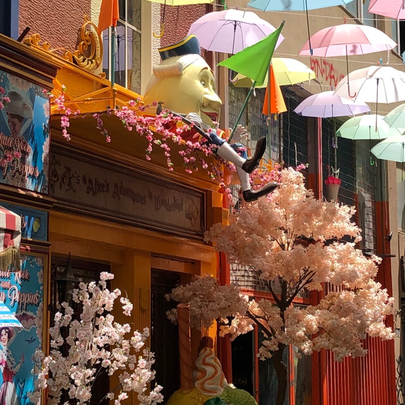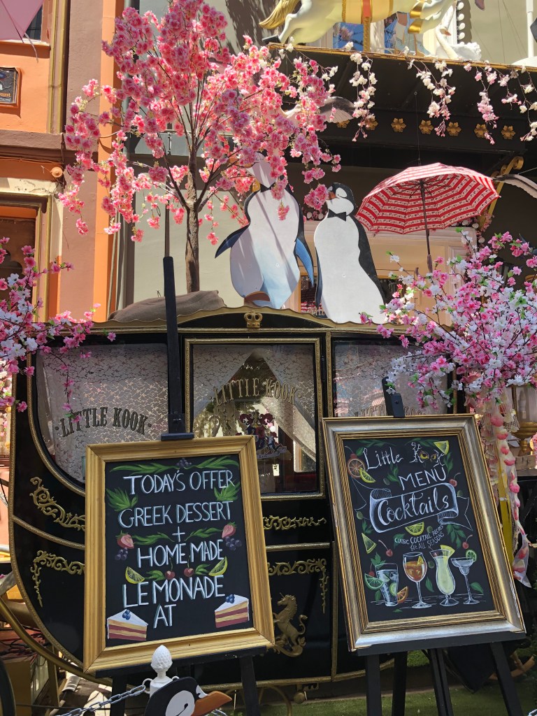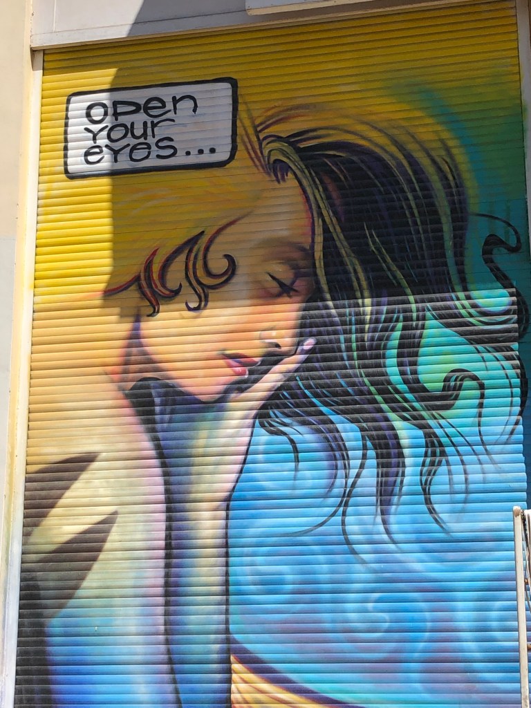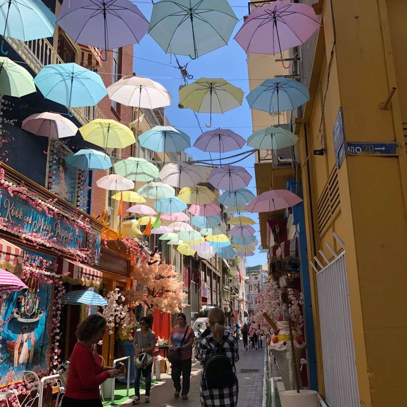 The 2nd day in Athens we took another private tour with Rosy and Al, Julie, and Jimmie and Pat. This one was a “foodie” tour of the old city. This was a walking tour and took us for baklava, olive oils, greek coffee, a stop at Miran’s Charcuterie and then another stop for slovaki and a beer. Needless to say we were not interested in having much for dinner. An observation: Athens is loaded with graffiti. Some of it is full sides of buildings and very well done. Perhaps the artist was commissioned to do it. But there is plenty of the usual looking graffiti which can really take away from what you are looking at. Another thing in Old Town was a section of a street with umbrellas hanging! I saw umbrellas hanging in Paris and now seeing umbrellas here, I decided to research this when I got home to see if there was any correlation. My brother and sister-in-law had been in Puerto Rico while I was away and they too saw an umbrella display. I researched this and found out about The Umbrella Sky Project which is an art installation by a Portuguese artist Patricia Cunha. These art installations have been spreading color and joy and love in streets around the world since 2011. I am assuming Athens was part of it.