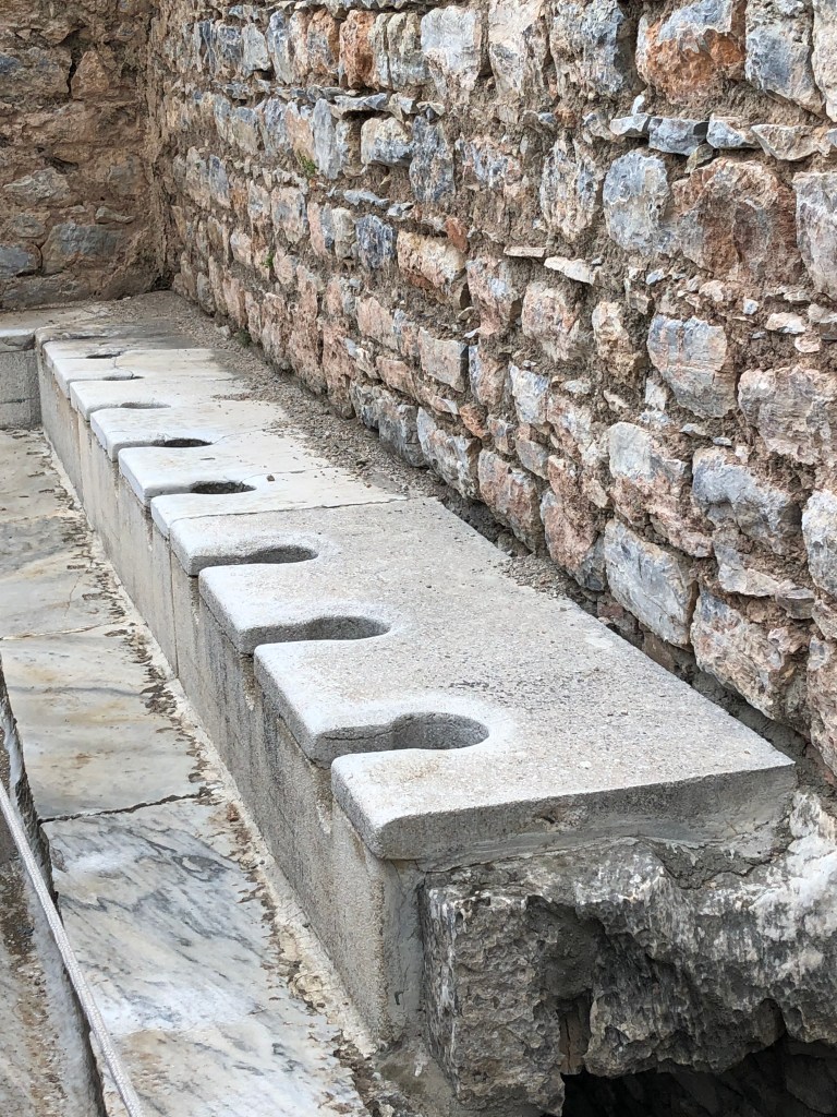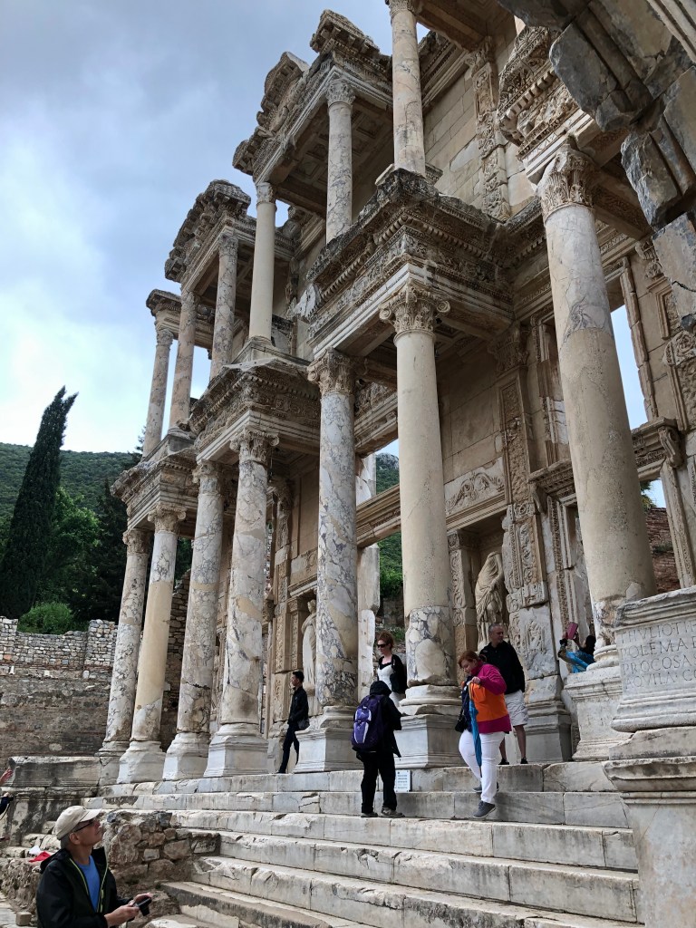 From here we went on to the ruins of Ephesus. This was totally incredible. There is just so much history in this part of the world. Some of the things you see fills you with awe when you think about how much was accomplished. The Great Theater here is amazing. It was constructed in the Hellenistic period and was remodeled many times in the Roman period. It is the largest theater in the Asia Minor. There are 24,000 seats and 1,000 standing places. There are still concerts in the ruins. Many are at the Library. One of the places that gave us a good laugh was the “public toilets”. Imagine all these men sitting around sharing the news of the day. It is said that slaves “warmed” the seats! We all decided we’d never be able to go! There are running competitions between the Greeks and the Turks as to who was responsible for so many of the names of things and expressions we all use today. One that our guide shared on our tour was the story was how when Cleopatra and Mark Anthony came to Ephesus “the red wine would flow”…and so began the expression putting out the RED CARPET for special events. The journey will continue to Rhodes, Crete and Naples in my next blog.