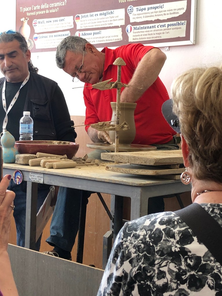 Lindos is known for its clifftop acropolis. We went to the town and enjoyed all of the whitewashed buildings. Among these buildings is the Virgin Mary of Lindos Church which has 15th century frescoes. The last part of the road that goes into the village is very narrow and only allowed small vehicles. We had to walk down the road which was very steep and narrow. On the way there was a car coming down the hill. The car sideswiped a woman in our group! She was just in front of me and it was quite a shock when she fell over. She got right up and said she was fine. The poor driver who hit her was so upset and I was afraid he would have a heart attack. She really was ok and kept up with everyone going into the village. If you felt that you needed a lift in the village you could hire a donkey. Speaking of donkeys, we bought our granddaughter a stuffed donkey that will “HeeHaw” several times with the push of a button. Just one more thing to drive parents crazy! The village and the church were quite beautiful. We left Lindos and made a stop at a ceramic demonstration at Bonis Ceramics. We got to see how the pieces were made and painted. Of course I could not pass up a few pieces that were the Owl which is a Greek symbol for knowledge and wisdom.