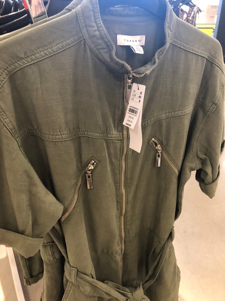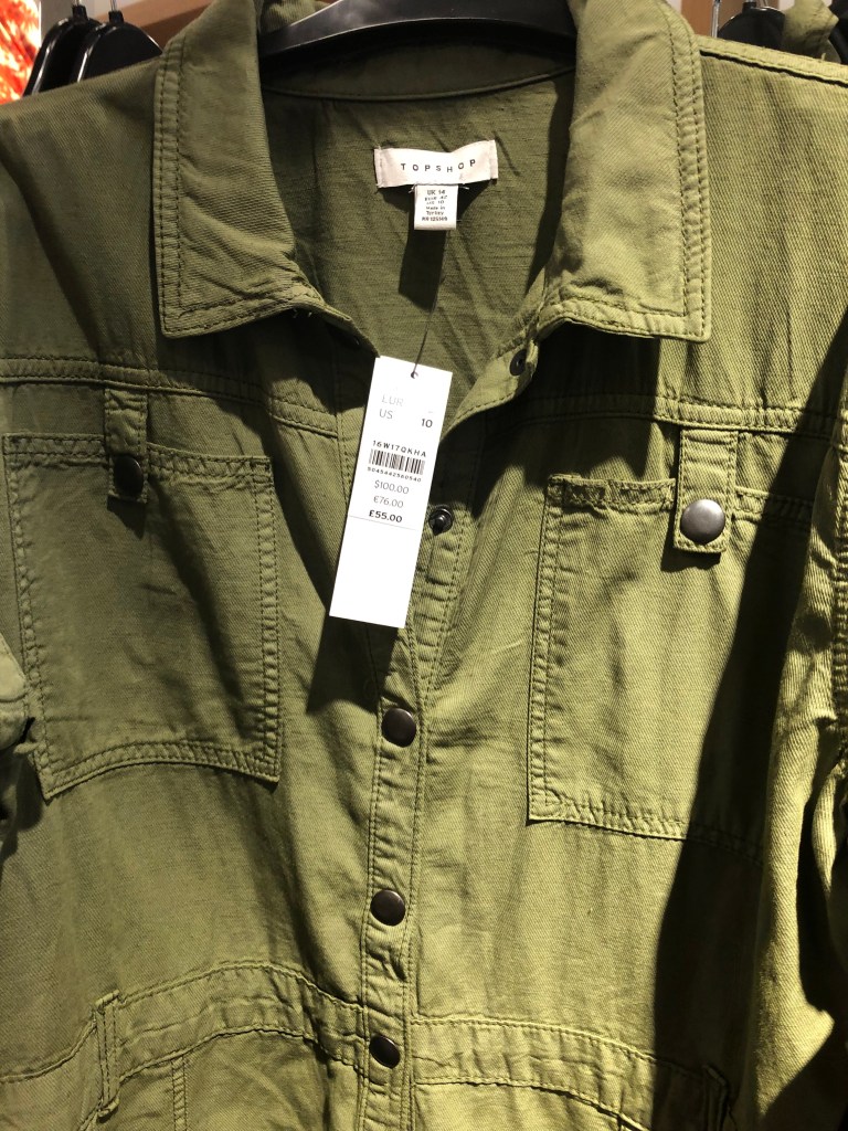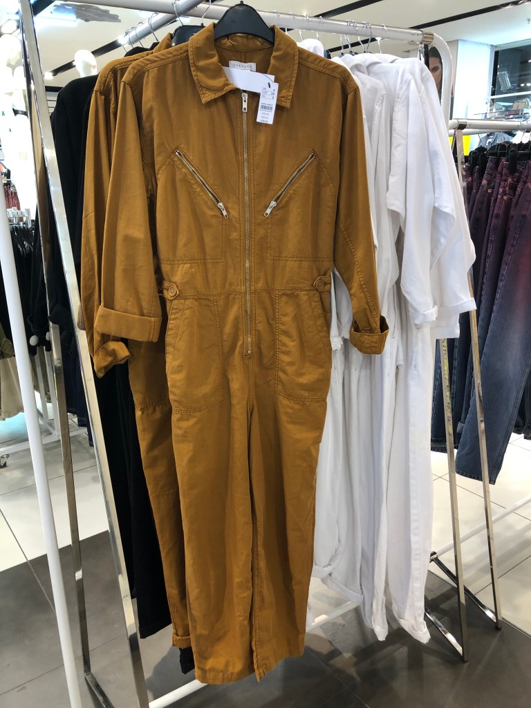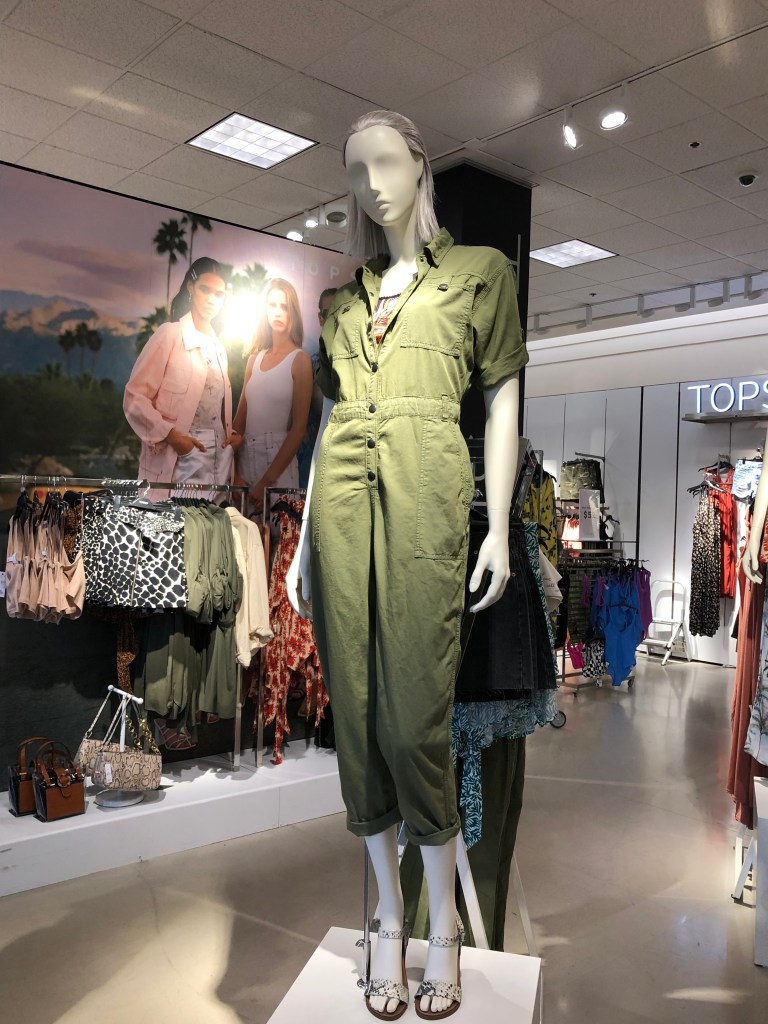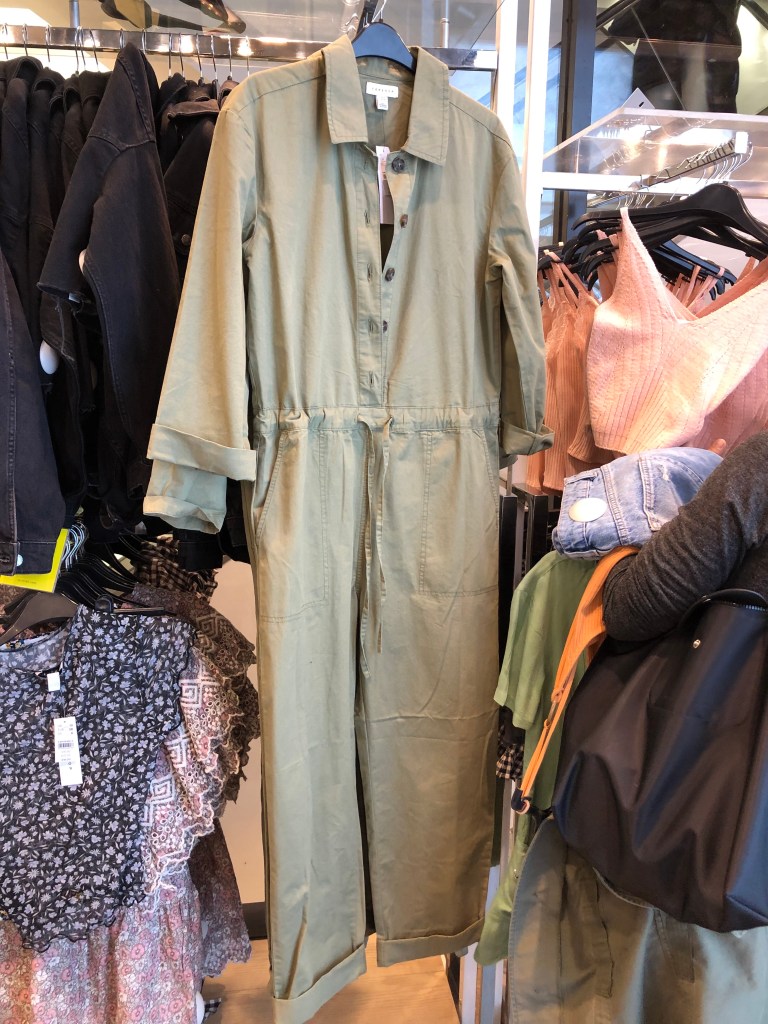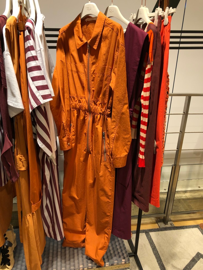 An on-trend look for fall is “Utility”-Boiler Jumpsuits, also referred to as Flight Suits, and utility pants are seen everywhere. Retails are all over the board. The silhouette is not for everyone. Long legs are a big help to carry off the look.
