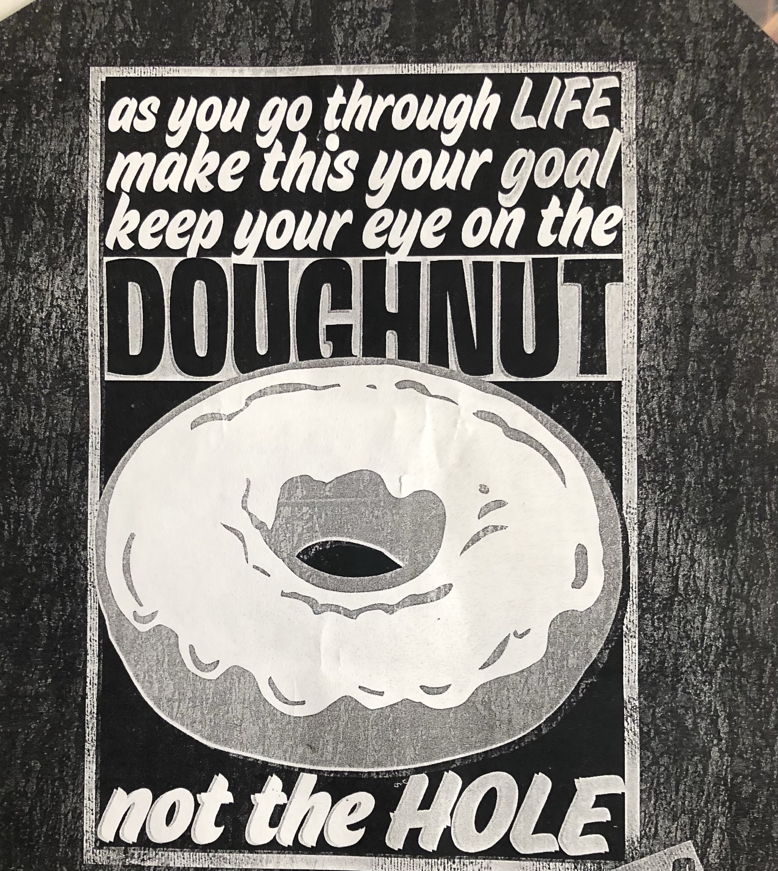 For my 100th blog I have chosen a piece of graphic art I purchased as a potential tee shirt screen print for the company I worked for. I kept a copy of the art and I have it taped on the inside door of a kitchen cabinet. I see it daily as I reach for a cup for my coffee each morning. I think it is one of the best things I have ever read, and it has carried me through all of the transitions in my life. As You Go Through Life Make This Your Goal, Keep Your Eye On The Doughnut Not On The Hole. I hope that it resonates with you. I look forward to writing and sharing many more blogs with you in the years ahead. I hope that you enjoy them.