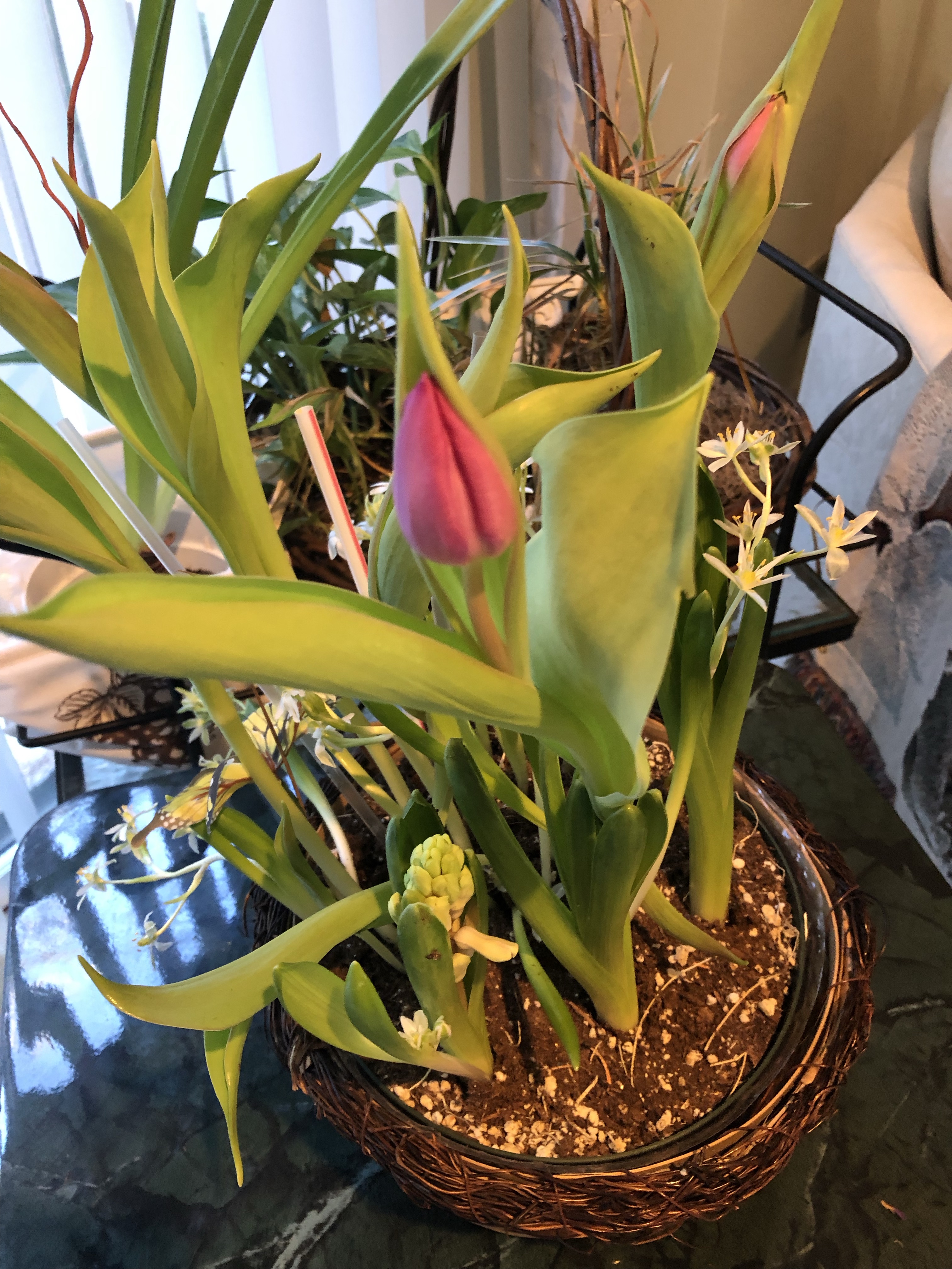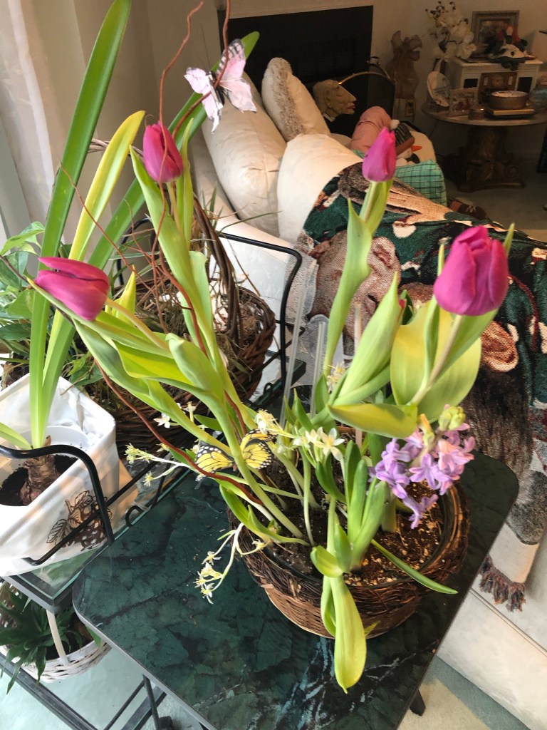 And here it is on 3/5. Tulips, hyacinths, mini stars of Bethlehem. I added the Butterflies because I like Butterflies and they give the stems support.