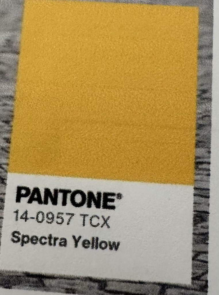 Spectra Yellow is a color that actually works on many skin tones. Wear this color solo or with neutrals white, beige, washed denim. Or if you are adventurous bring on pinks, oranges, or purples.